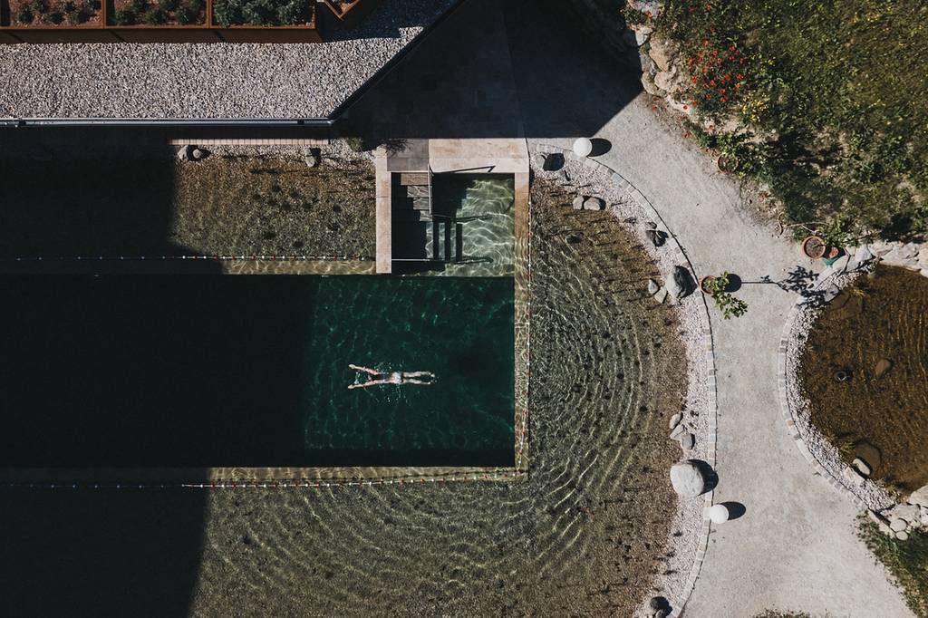 Klares, belebtes Wasser. Kein Chlor, keine Zusätze – nur Natur. Unser Naturbadeteich misst 15 x 5 Meter und wird durch eine stille Pflanzenzone gereinigt. Was ihn besonders macht: das feine Gefühl von Granderwasser auf der Haut – weich, lebendig, fast schwerelos. Ein paar Züge inmitten der Stille. Vielleicht ein tiefer Atemzug. Und plötzlich ist da nur noch dieses Eine: das Jetzt.