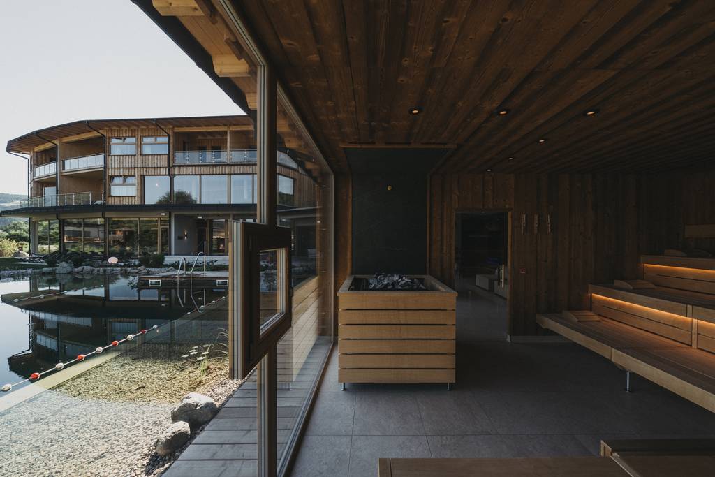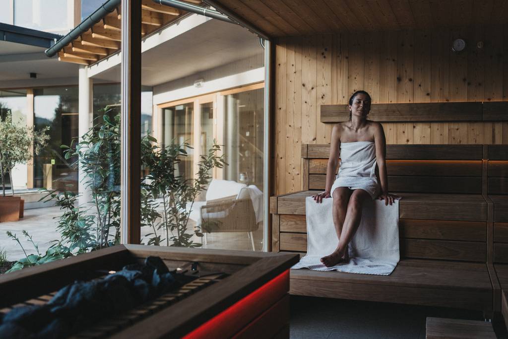 Viel Glas, warmes Holz und der Blick hinaus zum Teich. In unserer Kräuterkuchl trifft sanfte Wärme auf den Duft frischer Kräuter aus dem eigenen Garten. Ein Ort zum Abschalten, Durchatmen – und einfach nichts tun. Mit rund 50 °C und wohltuender Luftfeuchtigkeit wirkt diese Soft‑Sauna besonders mild und beruhigend. Wärme, die umhüllt, ohne zu beschweren – und Stille, die lange nachklingt.