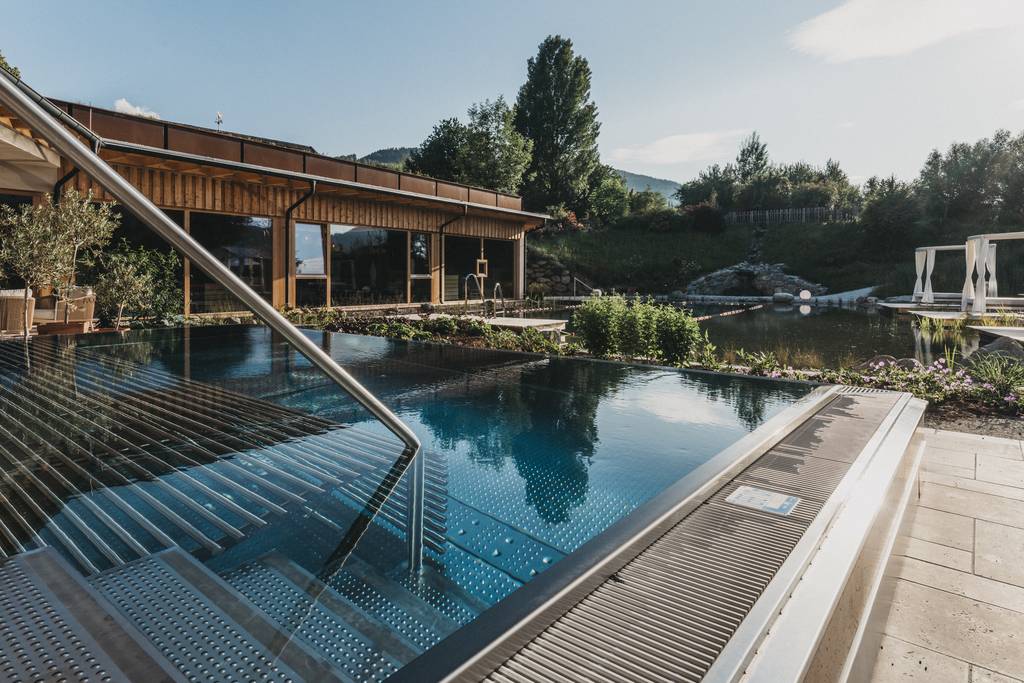 Der Gart’l Spa ist unser Adults Only Bereich: ein stiller Rückzugsort nur für Erwachsene, die Wärme, Wasser und Ruhe mit allen Sinnen spüren möchten. Keine Musik, kein Lärm. Stattdessen das Plätschern des Naturbadeteichs, das sanfte Prickeln des Whirlbeckens, der Duft von frischen Kräutern aus dem Paradiesgart’l.